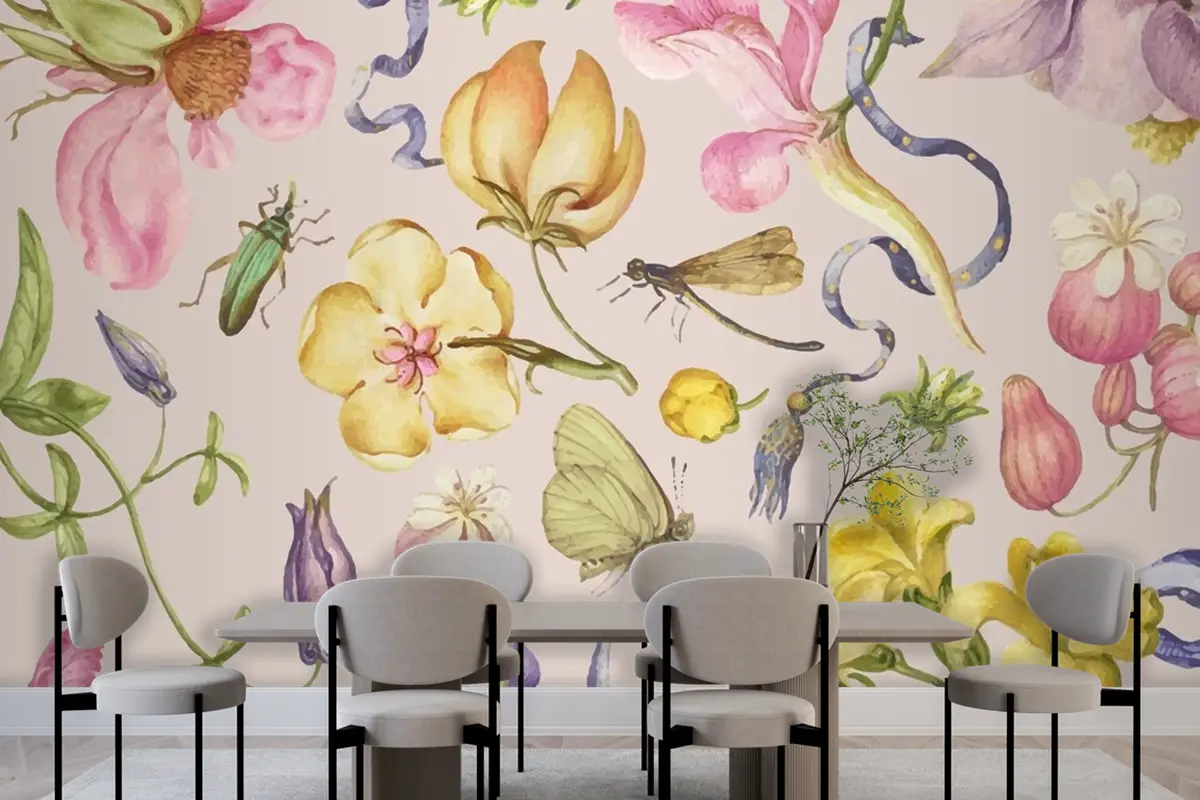 Pembe Duvar Kağıdı Duvarında Renkli Vintage Çiçek Desenli Vektör