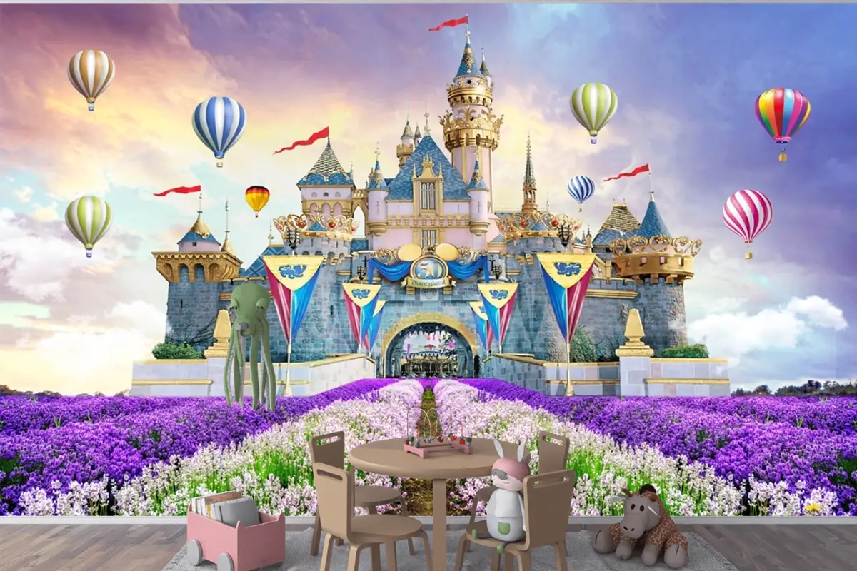 Peri Kalesi Manzara Çiçekler Sıcak Hava Balonları Çocuk Odası Duvar Kağıdı