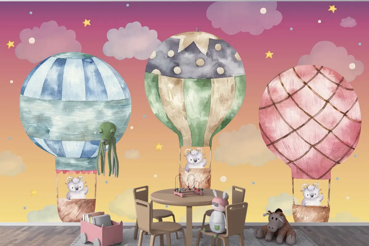 Renkli Balonlar Üzerinde Uçan Sevimli Koç Çocuk Odası Duvar Kağıdı