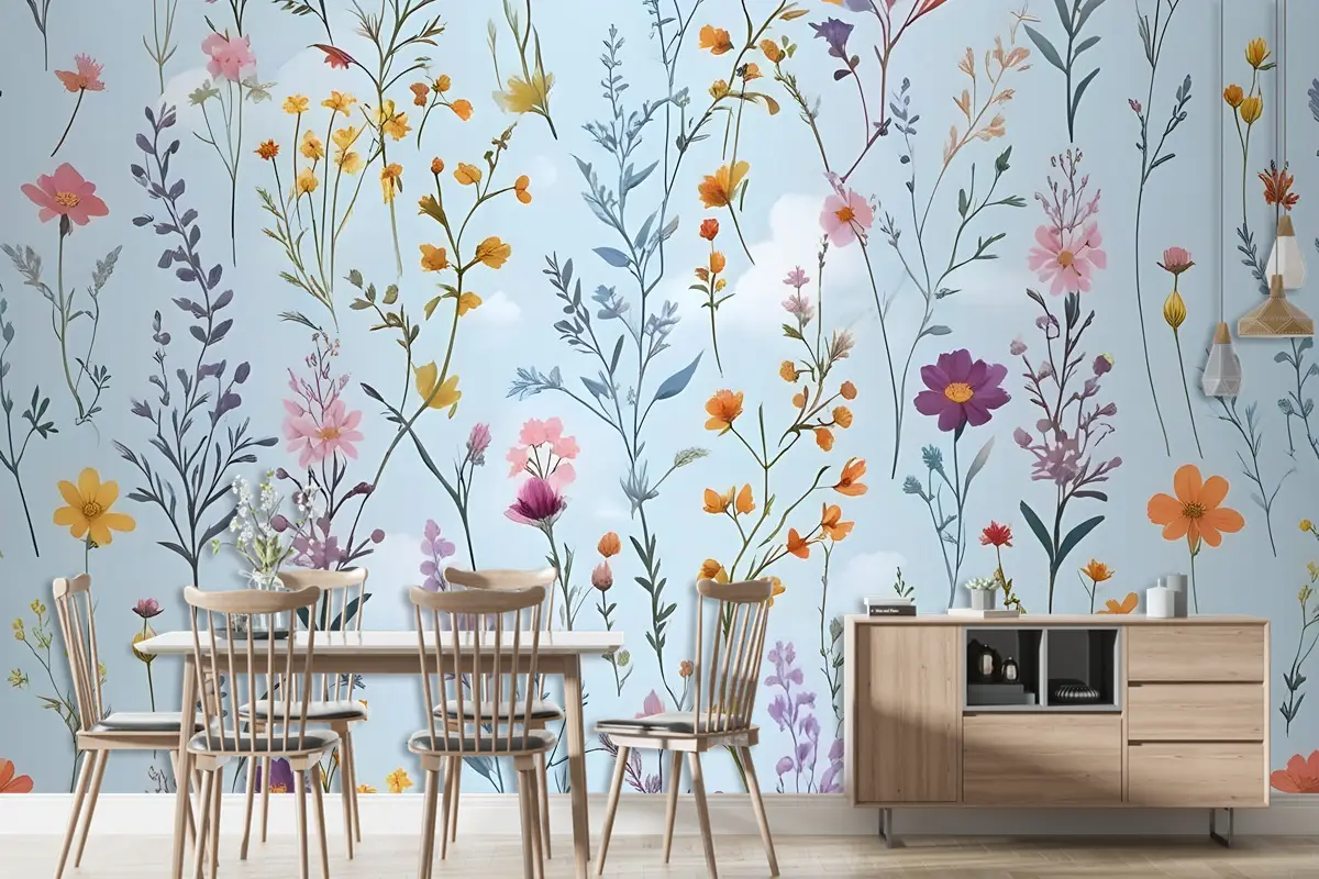 Renkli Çiçekler Mavi Duvar Kağıdı