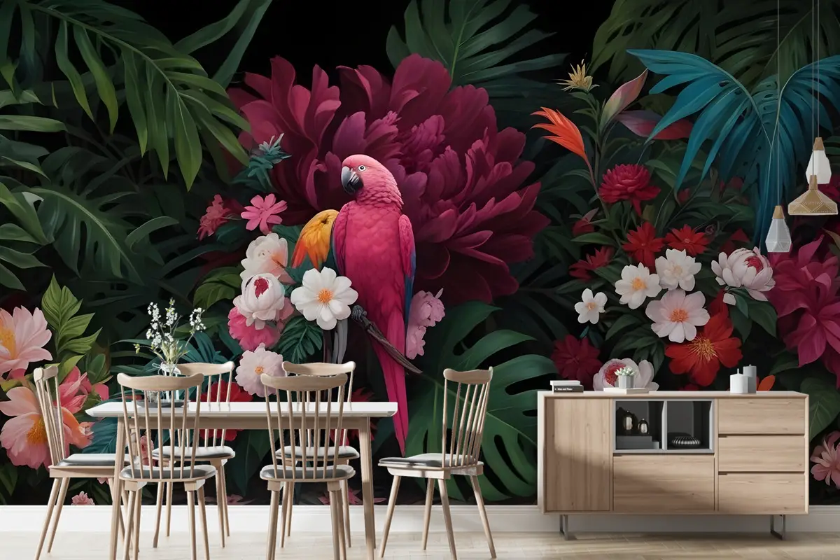 Renkli Çiçekli Pembe Papağan Duvar Kağıdı