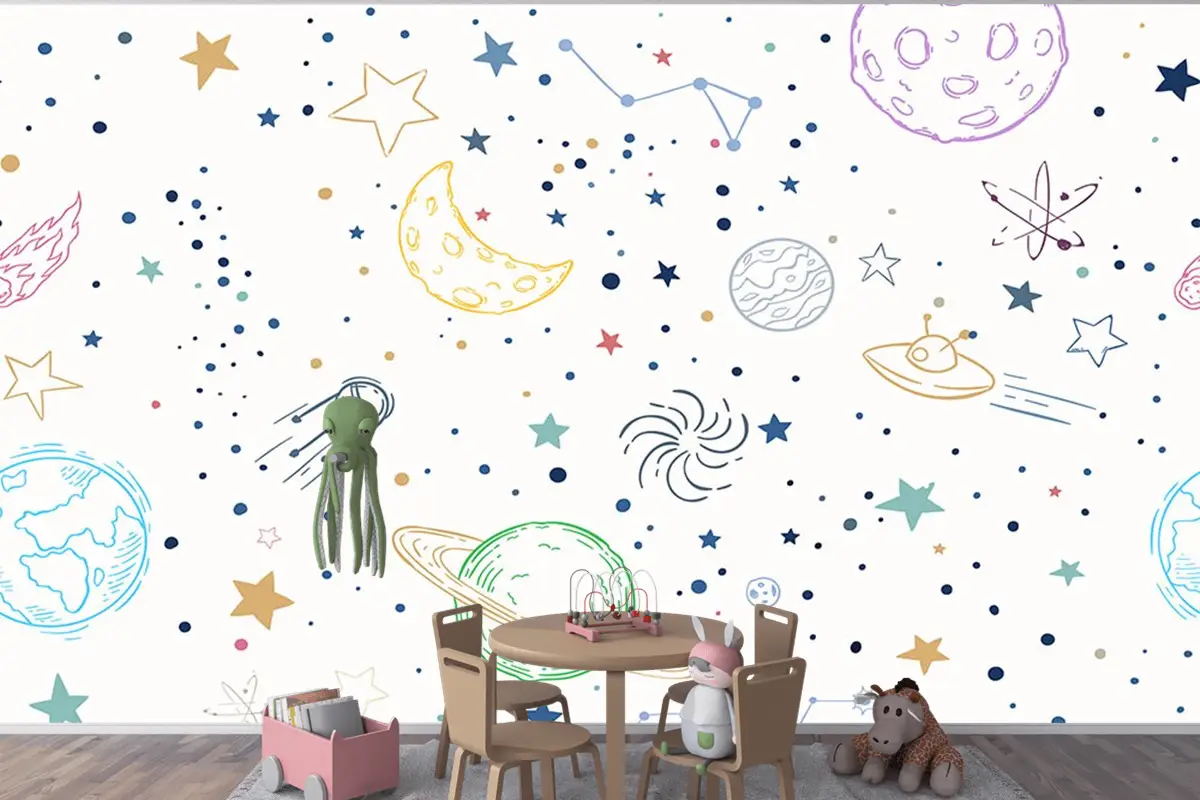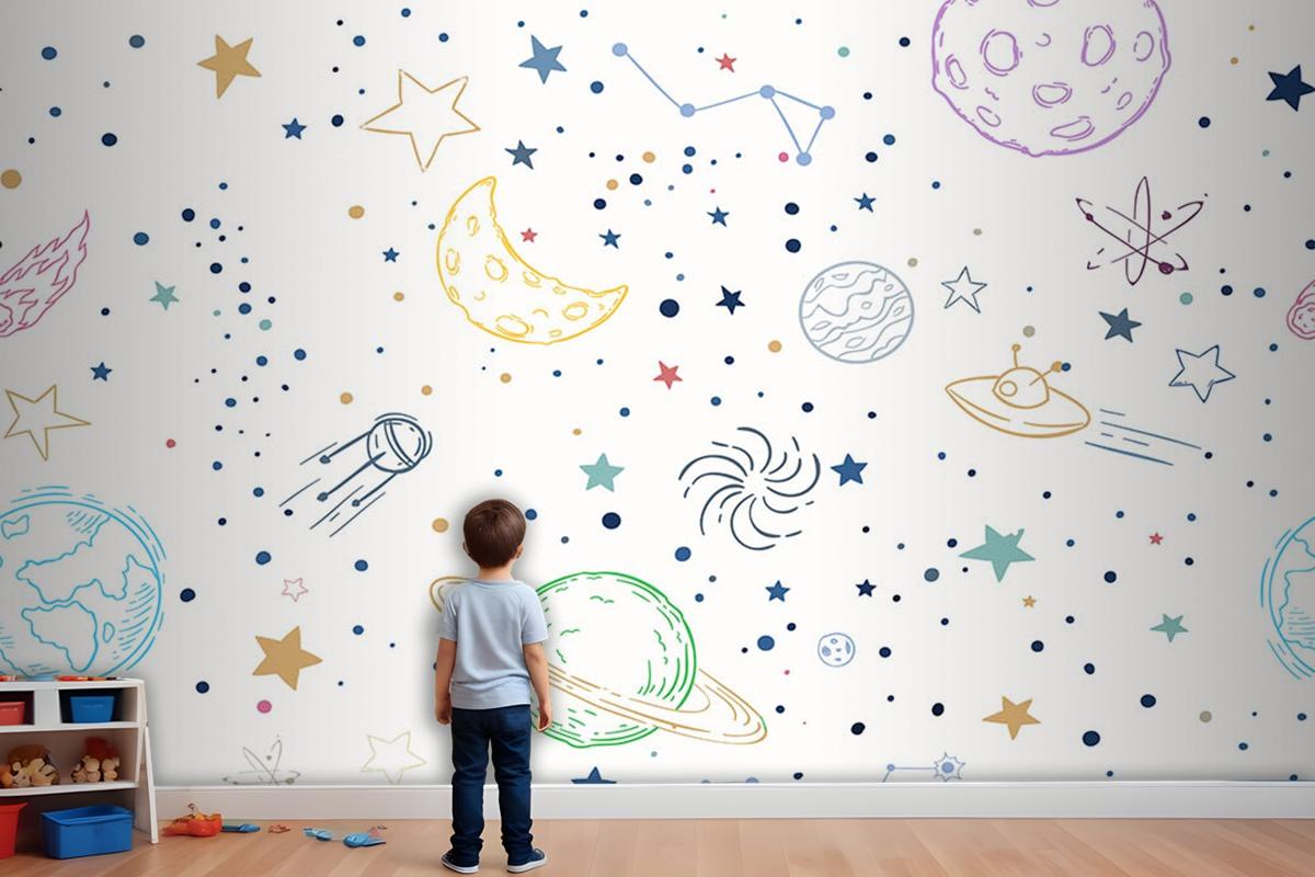 Renkli Gezegenler Uzay Temalı Çocuk Odası Duvar Kağıdı