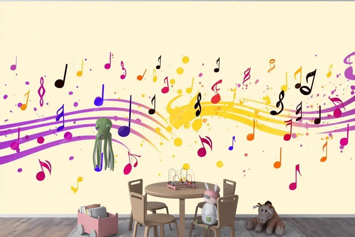Renkli Müzik Notaları Sarı Arka Plan Çocuk Odası Duvar Kağıdı