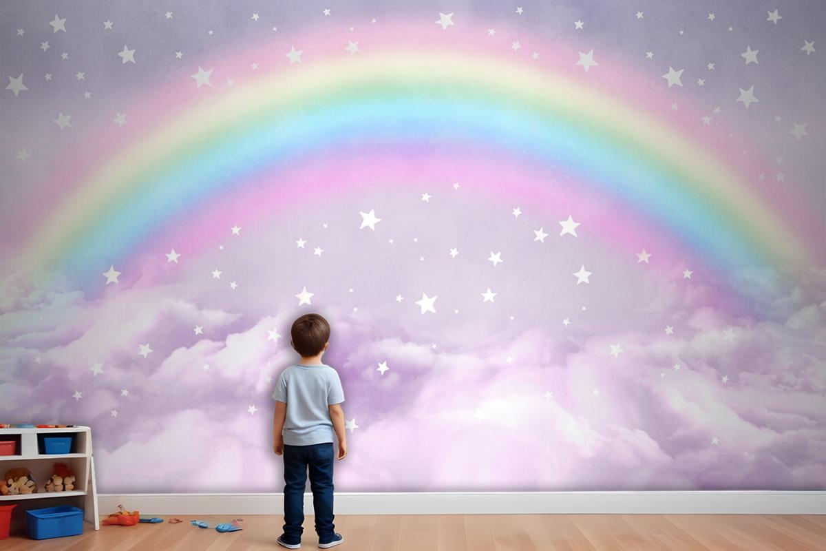 Renkli Pastel Gökkuşağı Ve Bulutlarla Çocuk Bebek Odası Duvar Kağıdı
