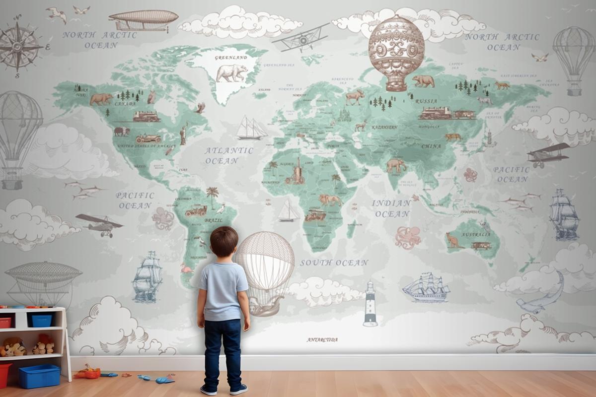 Retro Dünya Haritası Vintage Sıcak Hava Balonları Ve Uçaklar Bebek Odası Duvar Kağıdı