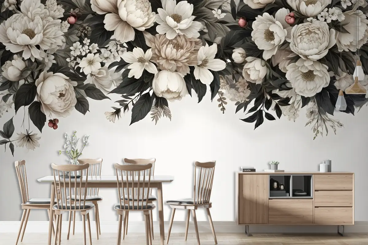Retro Koyu Beyaz Çiçekler Duvar Kağıdı