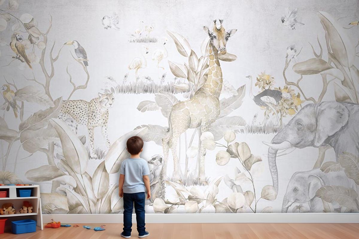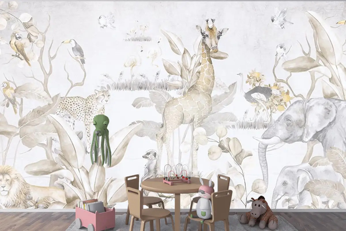 Safari Hayvanları Ve Ağaçlar Çocuk Odası Duvar Kağıdı