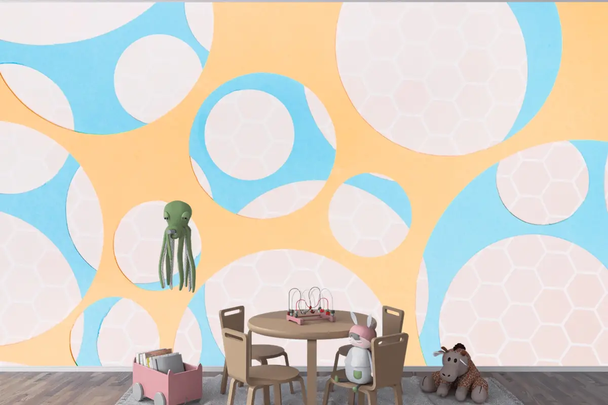 Sarı Çocuk Odası Duvar Kağıdı Duvar Üzerinde Daire Şeklinde Petek Deseni