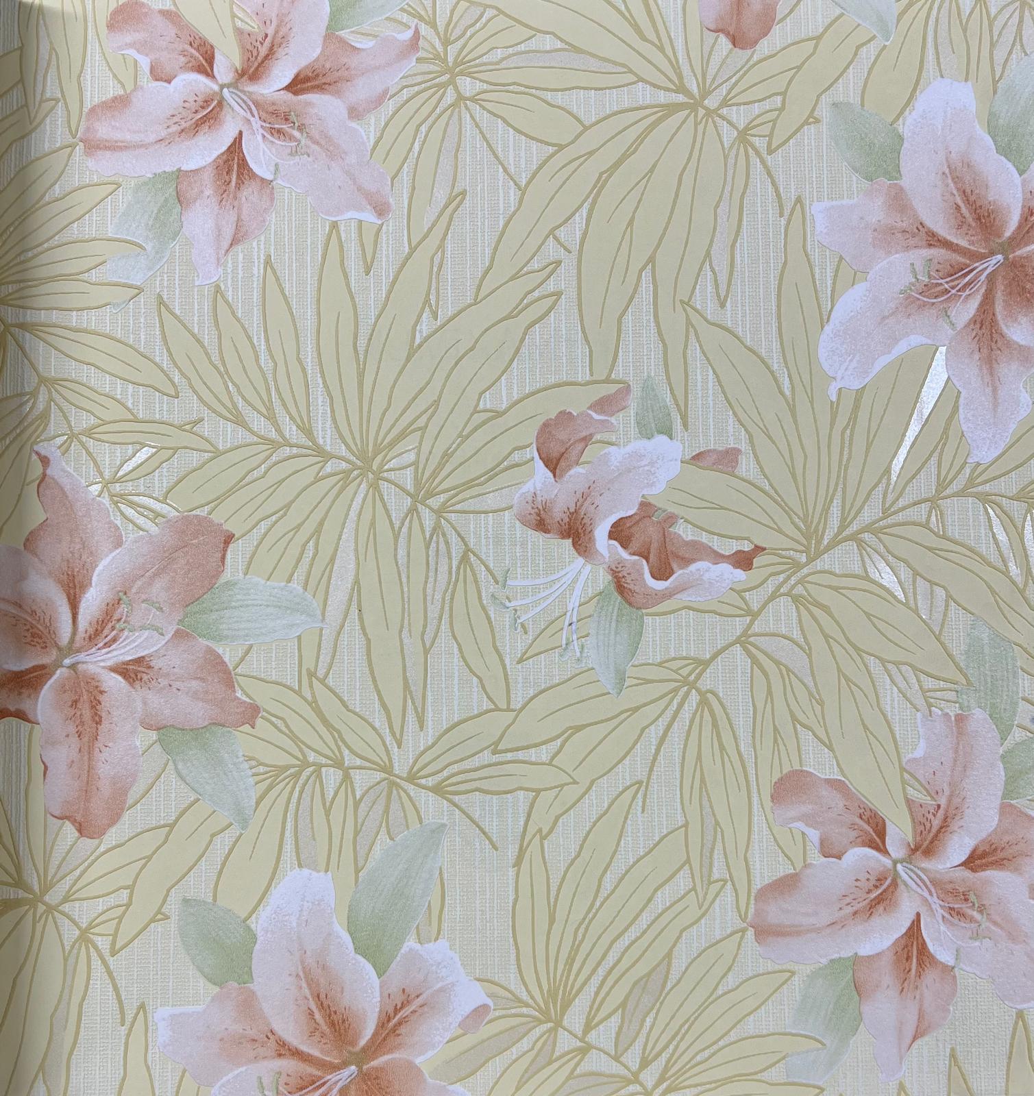 Sarı Yapraklar Pembe Çiçekli Tropikal Duvar Kağıdı 669534