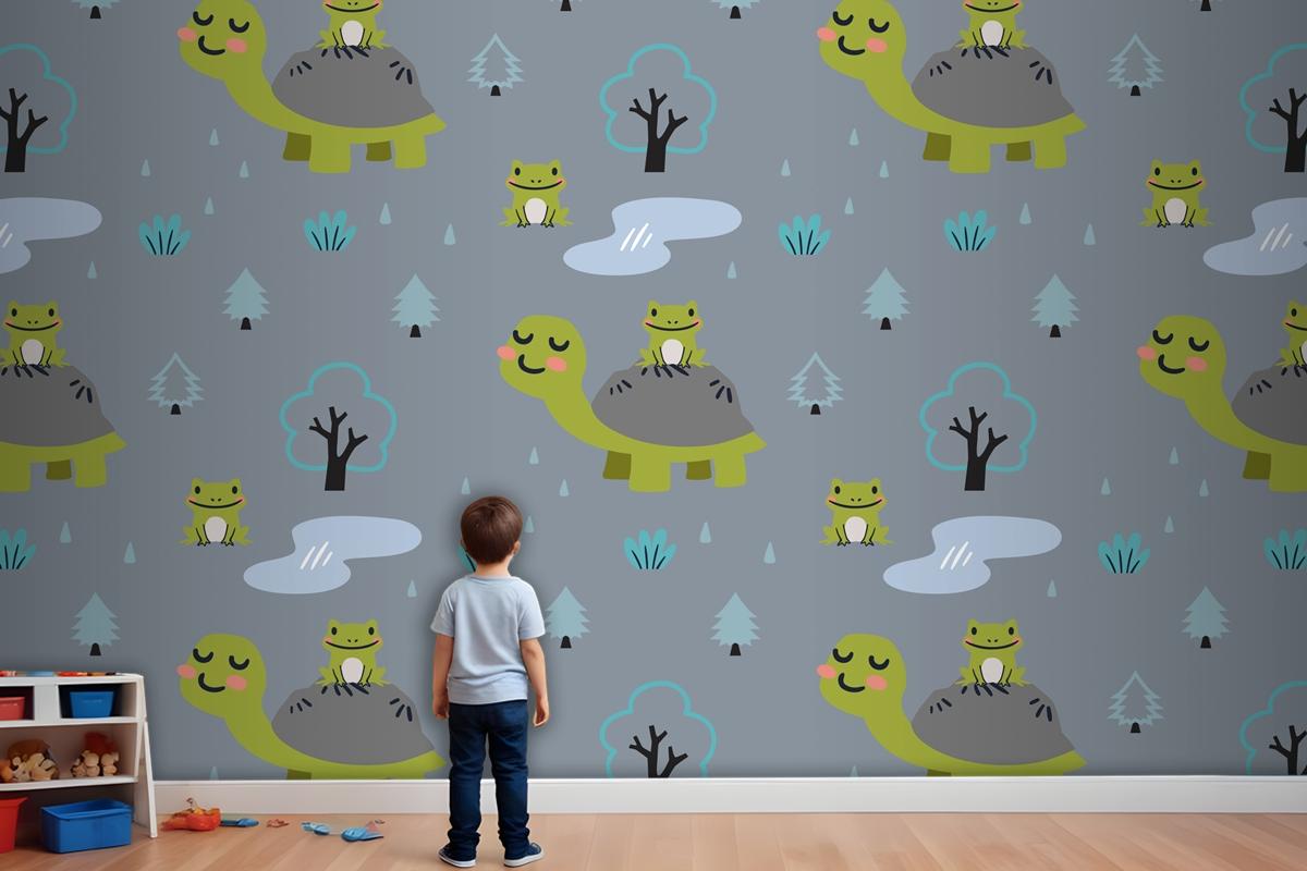 Sevimli Anne Kaplumbağa Ve Kurbağalar Ile Karikatür Hayvanlar Desen Çocuk Odası Duvar Kağıdı