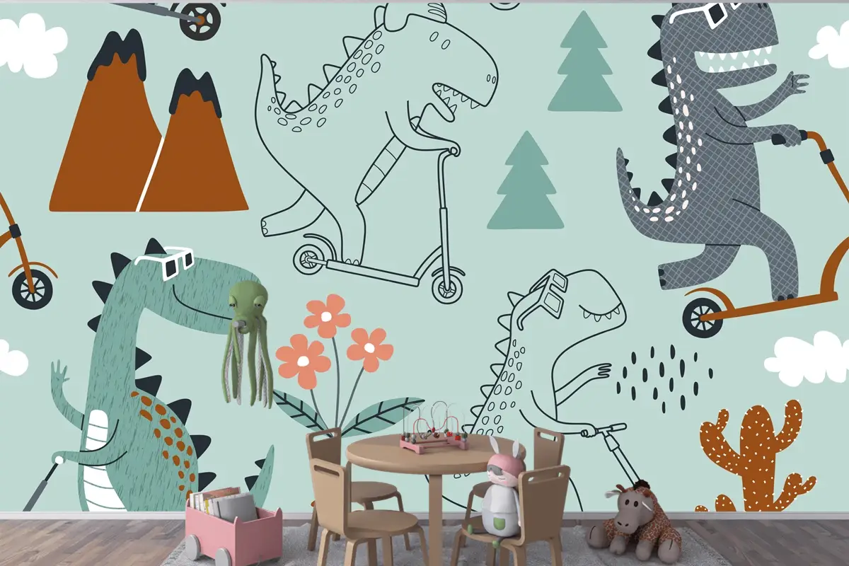 Sevimli Dinozor Scootera Biniyor Çocuk Odası Duvar Kağıdı