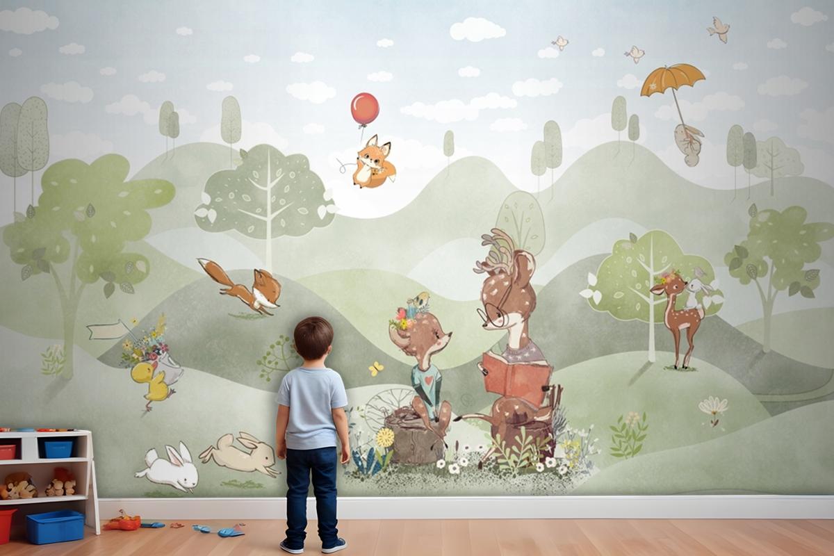 Sevimli Hayvanlar Orman Çizim Geyik Tilki Tavşan Yaz Manzarası Bebek Odası Duvar Kağıdı