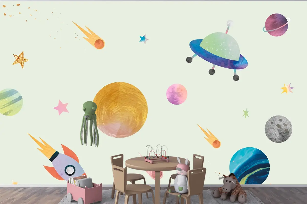 Sevimli Suluboya Tarzında Renkli Galaksi Desenli Arka Plan Çocuk Odası Duvar Kağıdı