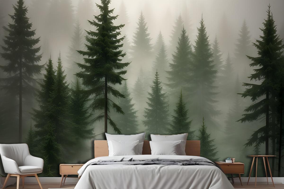 Sisli Sisli Bir Ortamda Uzun Yaprak Dökmeyen Ağaçlardan Oluşan Yoğun Orman Yatak Odası Duvar Kağıdı