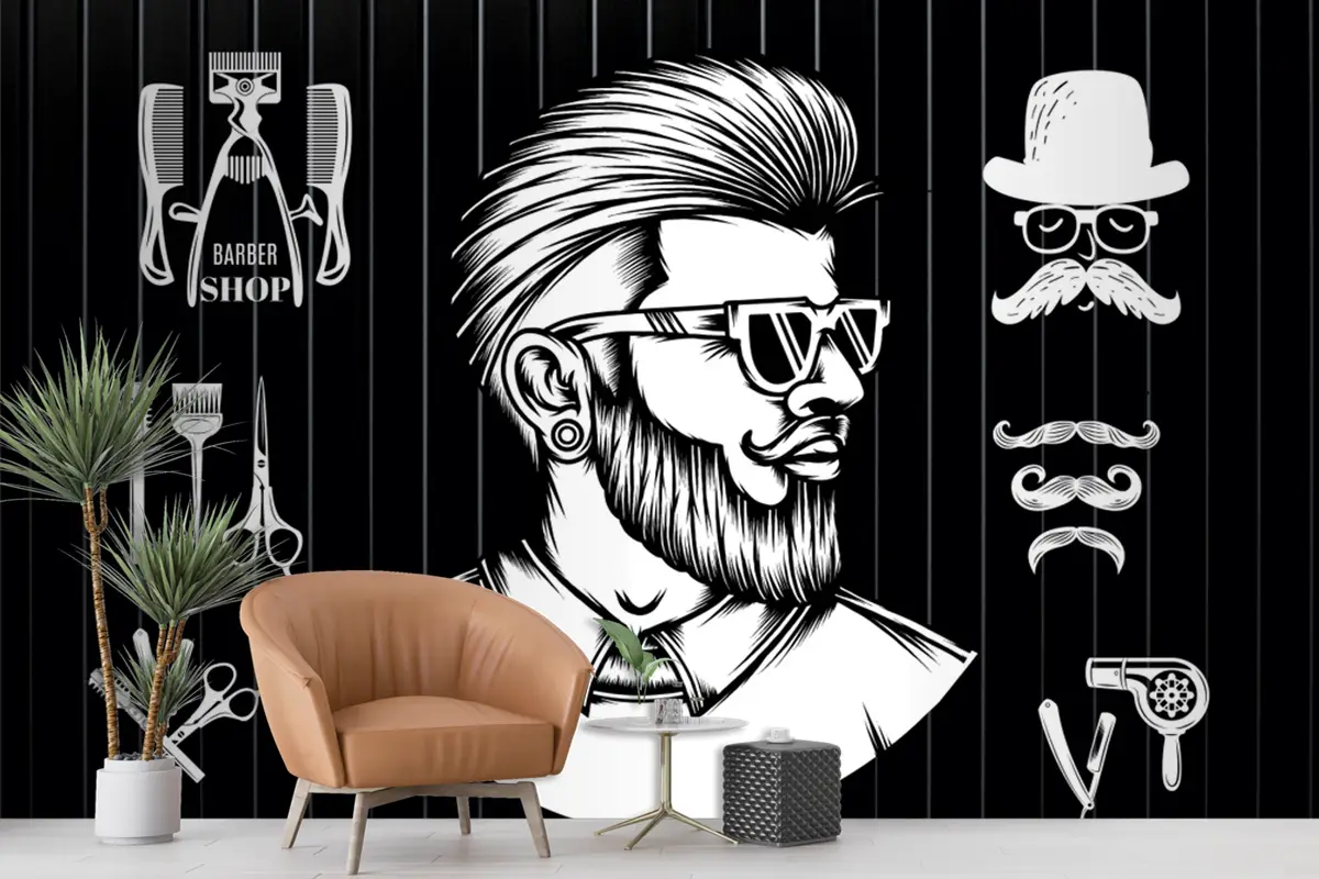 Siyah Arka Olan Beyaz Berber Aletleri Ve Erkek Salon Kuaför Duvar Kağıdı