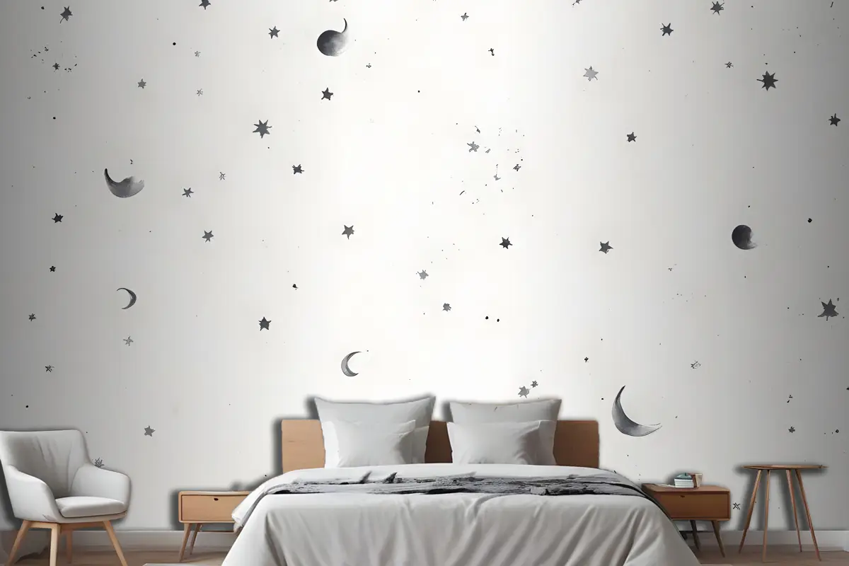 Siyah & Beyaz Ay Ve Yıldızlar Yatak Odası Duvar Kağıdı