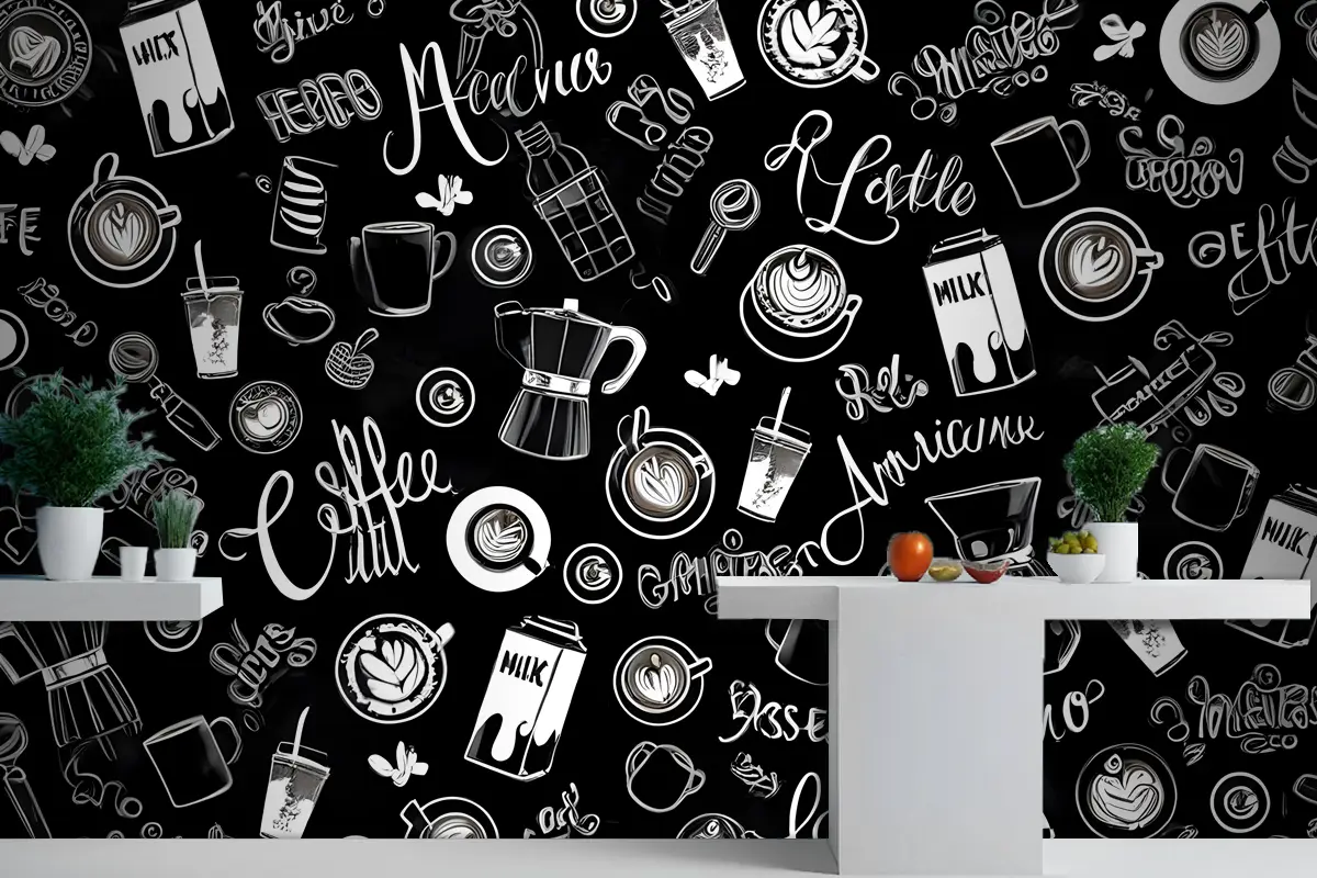Siyah & Beyaz Kahve Fincanı Desen Mutfak Duvar Kağıdı