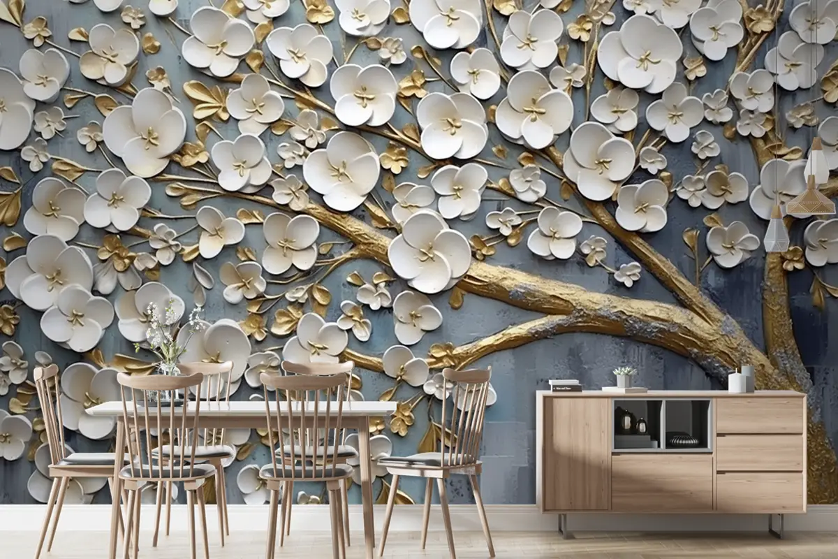Soyut Sanatsal Arka Plan Çiçekler Dallar Altın Ve Tuval Boyama Duvar Kağıdı Duvar
