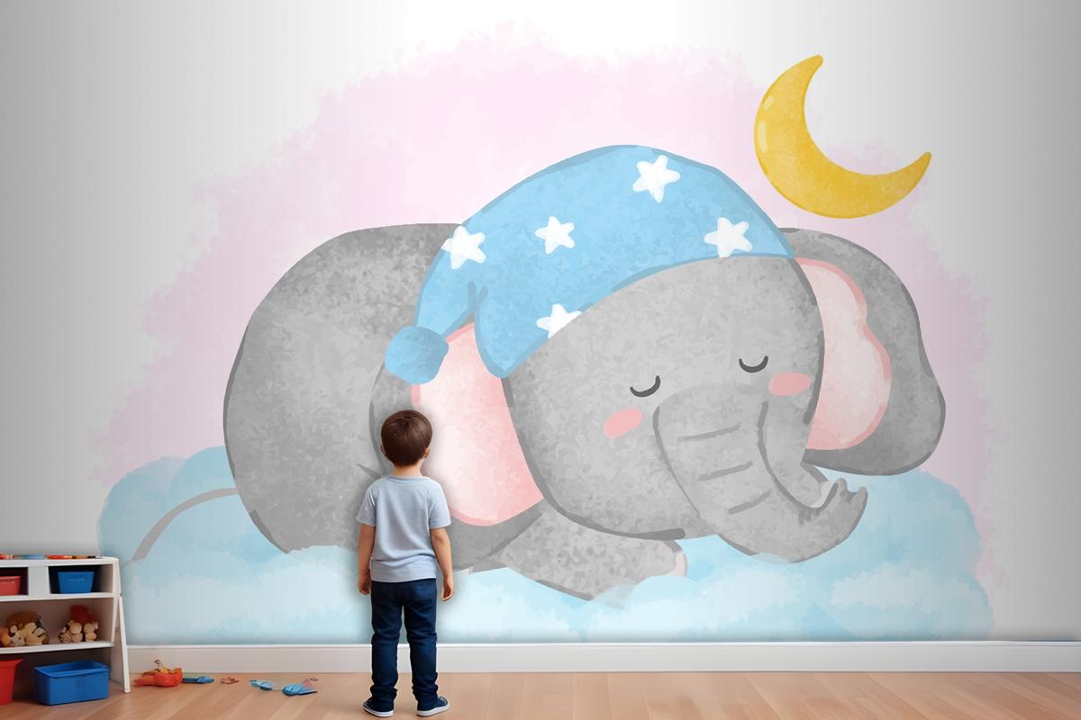 Suluboya Çocuk Odası Duvar Kağıdı Nde Bulutun Üzerinde Uyuyan Güzel Fil