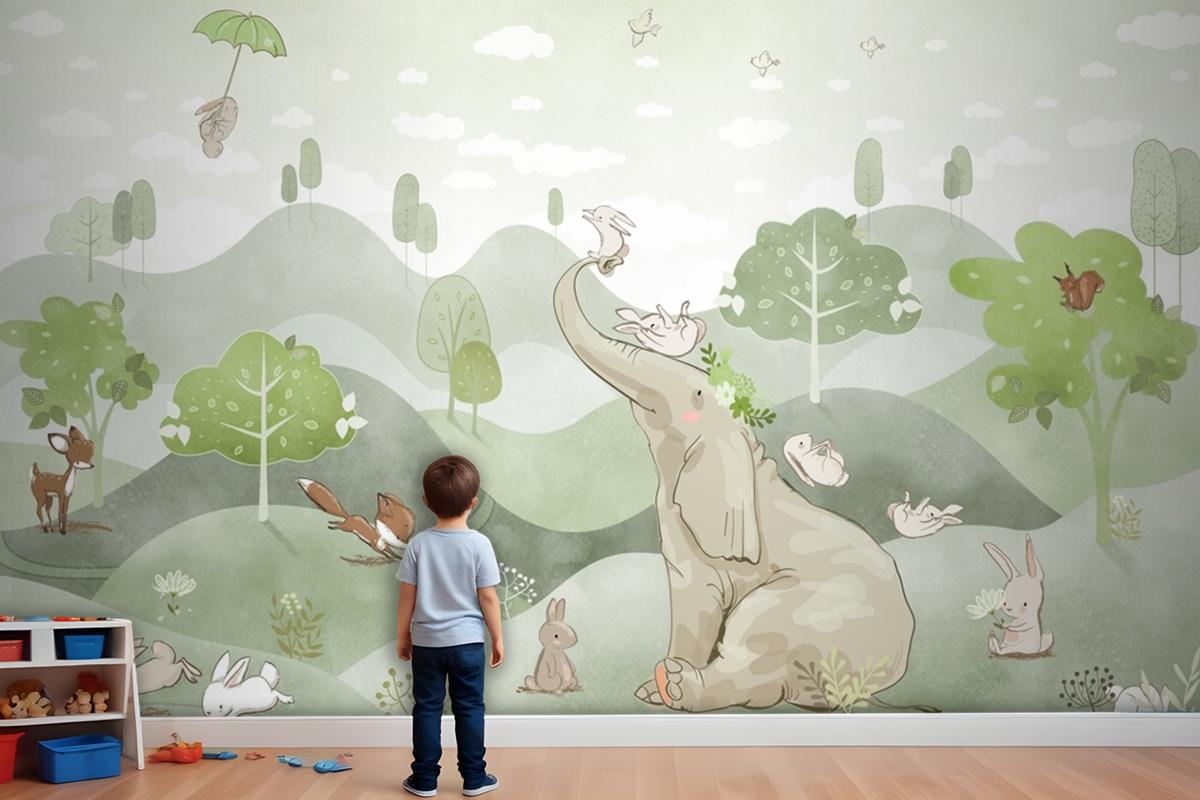 Suluboya Fil Tilki Geyik Bebek Odası Duvar Kağıdı