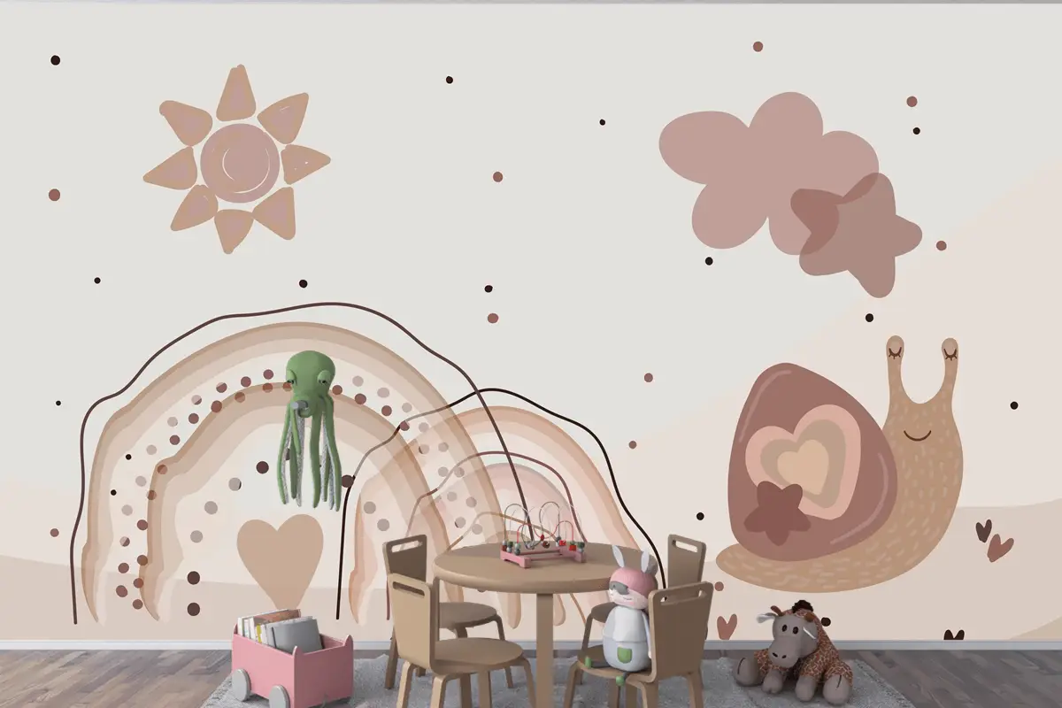 Suluboya Gökkuşağı Ve Salyangoz Bej Çocuk Odası Duvar Kağıdı