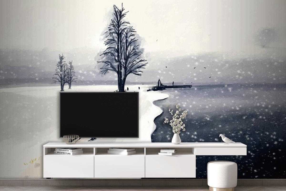 Suluboya Kış Manzarası Oturma Odası Salon Duvar Kağıdı