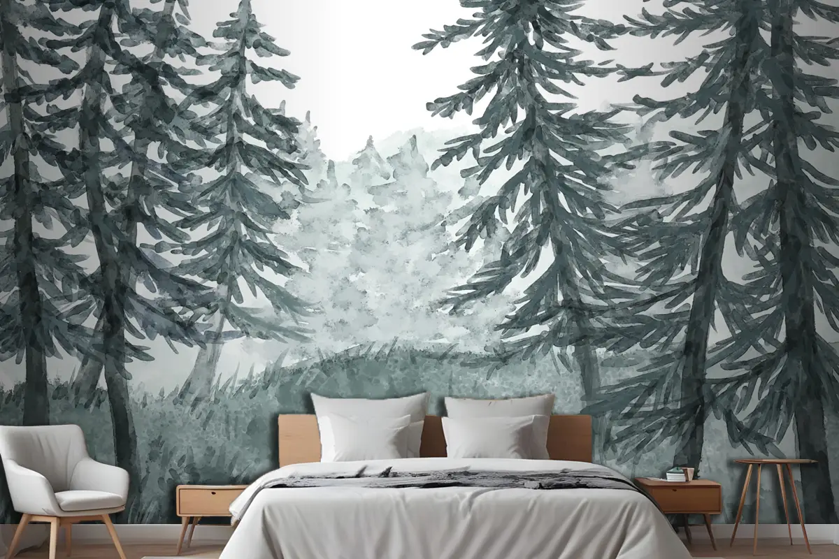 Suluboya Orman Manzarası Yatak Odası Duvar Kağıdı