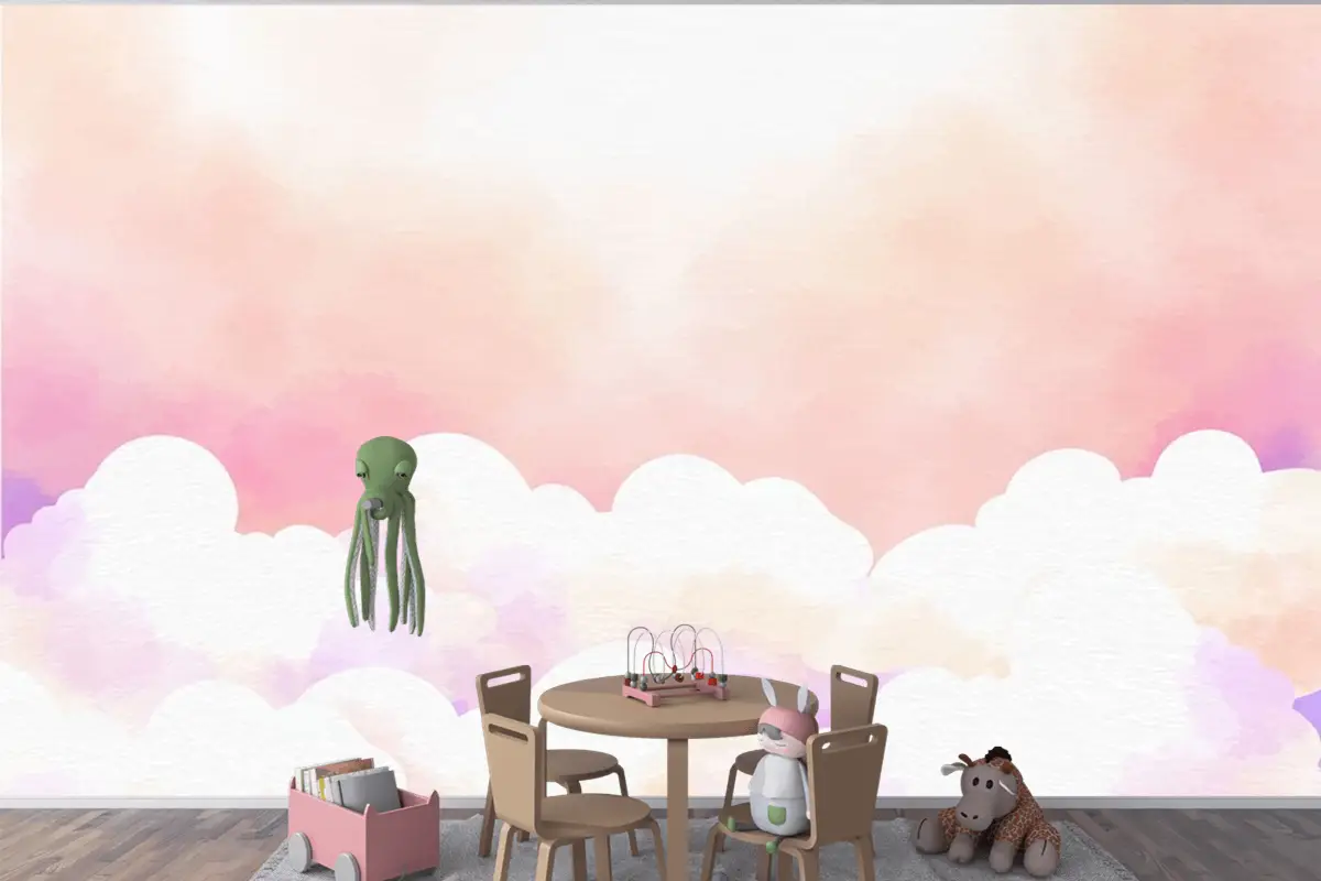 Suluboya Şeker Pamuk Bulutlar Arka Plan Çocuk Odası Duvar Kağıdı