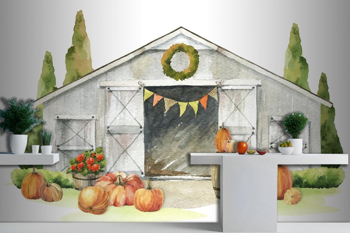 Suluboya Sonbahar Ahşap Ahır Kabak Hasat Mutfak Duvar Kağıdı