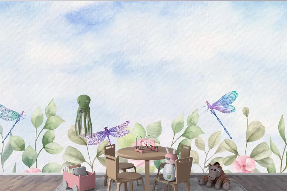 Suluboya Yabani Yapraklar Yusufçuk Çocuk Odası Duvar Kağıdı Ile Manzara Arka Plan