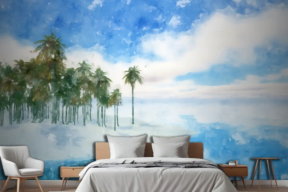 Suluboya Yaz Tropikal Yatak Odası Duvar Kağıdı