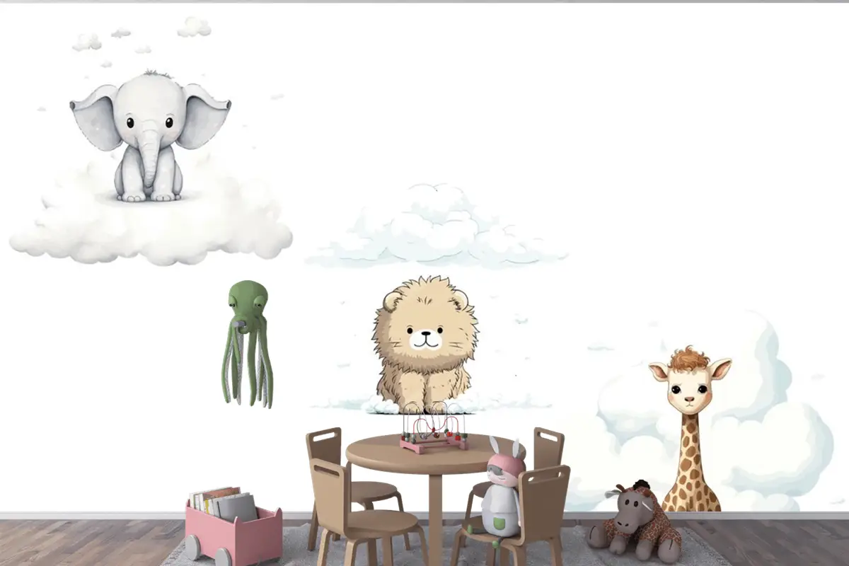 Sute Bebek Komik Hayvanlar Fil Zürafa Aslan Çocuk Odası Duvar Kağıdı Seti