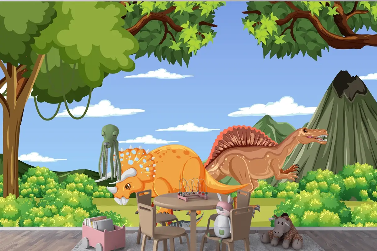 Tarih Öncesi Orman Sahnesinde Dinozor Çocuk Odası Duvar Kağıdı