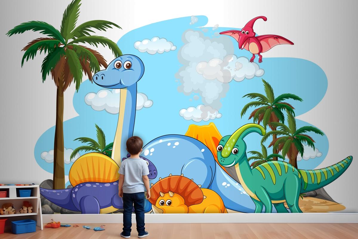 Tarih Öncesi Topraklarda Birçok Sevimli Dinozor Karakteri İzole Çocuk Odası Duvar Kağıdı