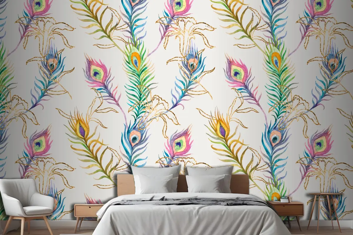 Tavus Kuşu Tüyü Renkli Suluboya Desen Yatak Odası Duvar Kağıdı Duvar Arka Planı