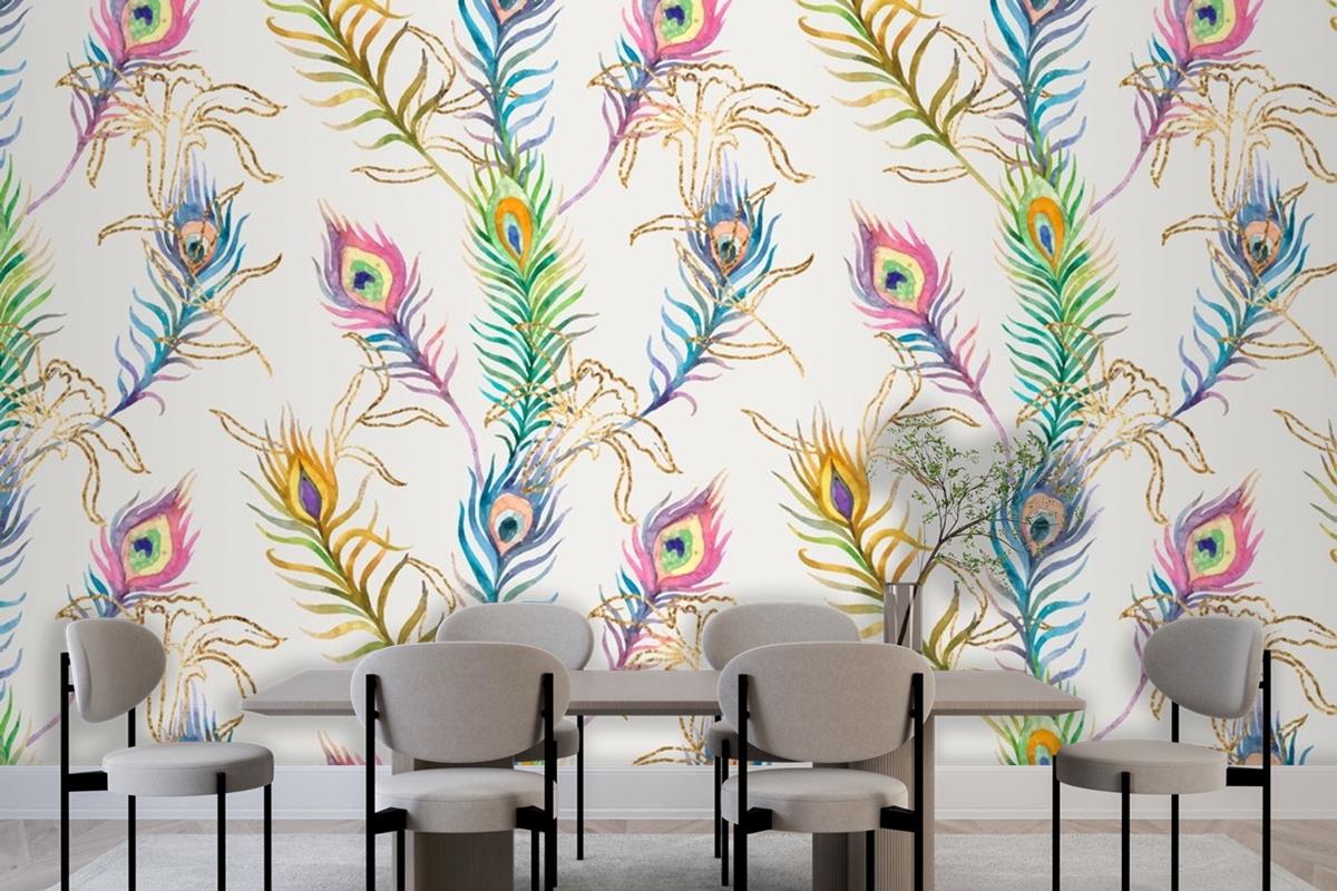 Tavus Kuşu Tüyü Renkli Suluboya Desen Yemek Odası Duvar Kağıdı Duvar Arka Planı