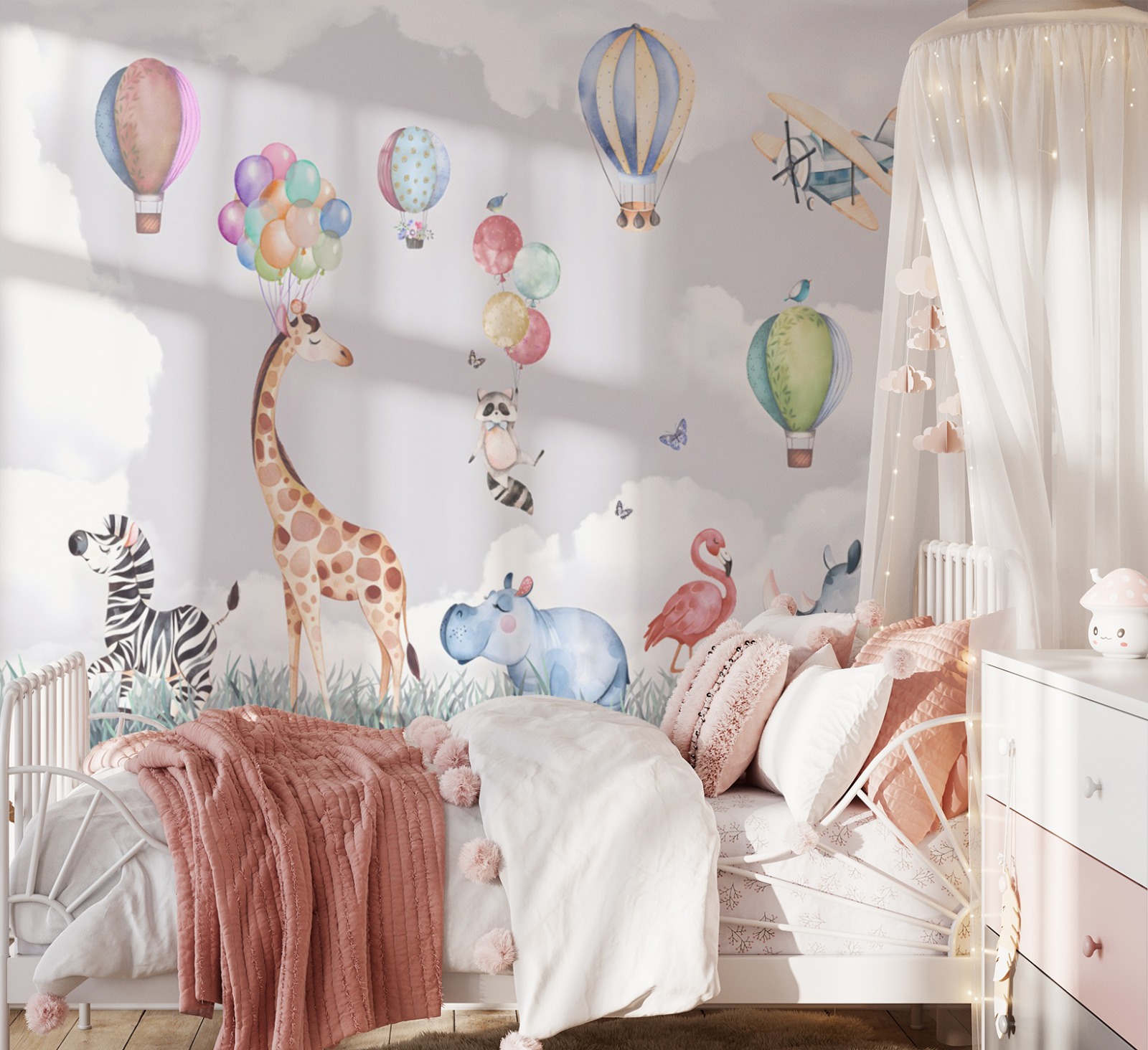 Tek Parça Kumaş Tekstil - Safari Hayvanları Zürafa Zebra Gergedan Flamingo Çocuk Odası Duvar Kağıdı