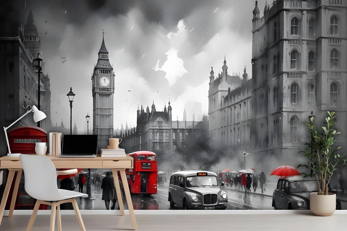 Tek Renkli Kömür Şehir Manzarası Ve Kırmızı Otobüs Duvar Kağıdı
