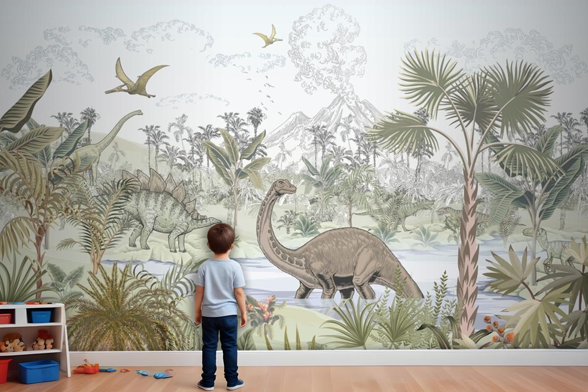 Tropikal Dinozor Çocuk Odası Duvar Kağıdı