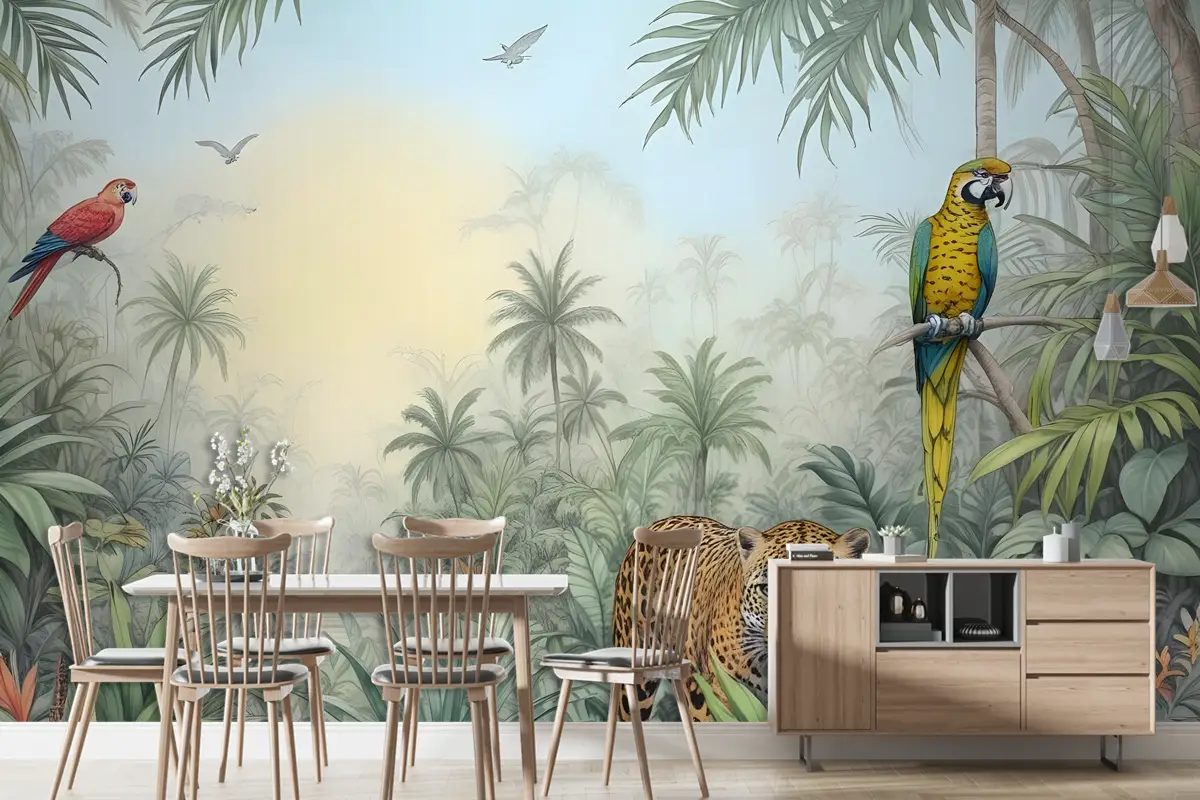 Tropikal Ormanda Leopar Ve Renkli Papağan Duvar Kağıdı