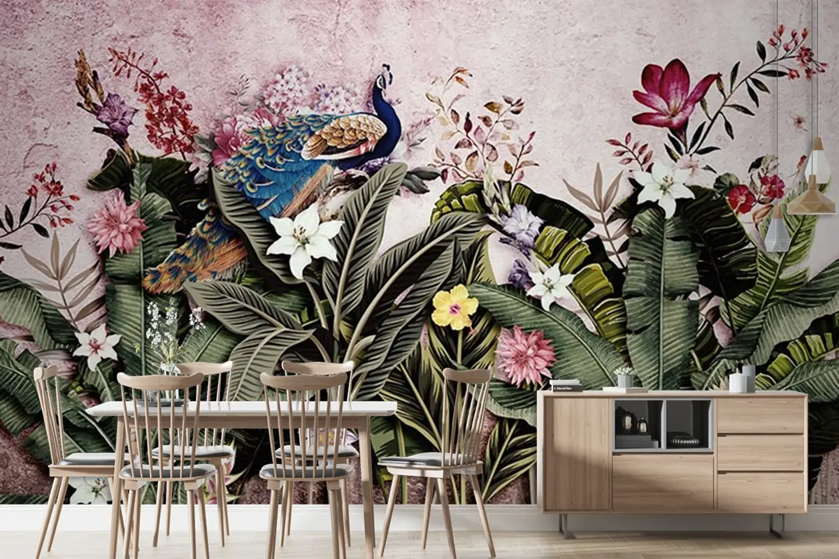 Tropikal Yapraklar Ve Tavus Kuşu Duvar Kağıdı