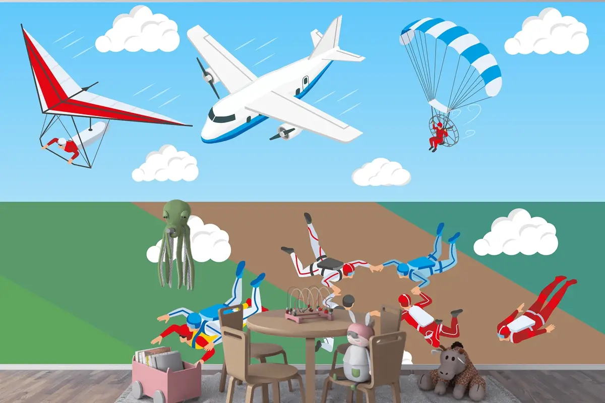 Uçak Yelken Havacılık Gökyüzünde Paraşütle Atlayan Bir Grup İnsan Çocuk Odası Duvar Kağıdı