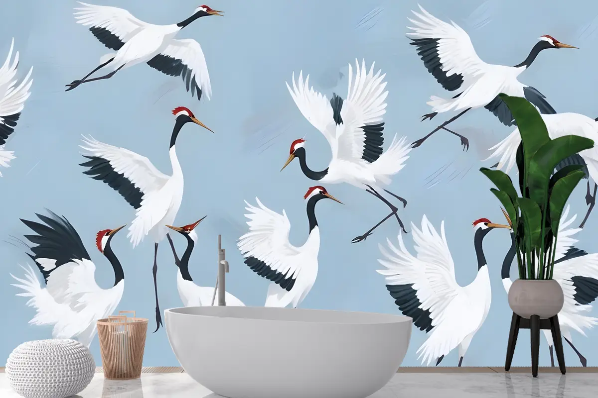 Uçan Japon Vinçleri Mavi Boyalı Banyo Duvar Kağıdı