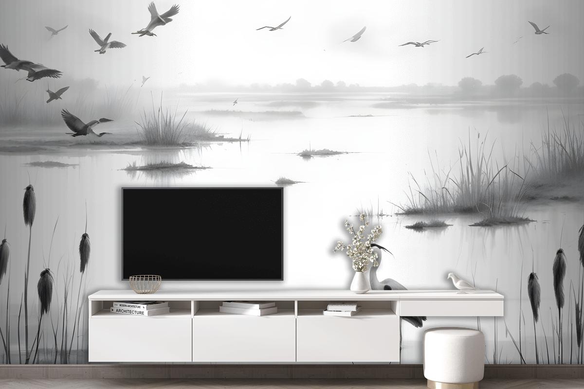 Uçan Kuşlarla Dumanlı Sulak Alanlarda Balıkçıl Kroki Oturma Odası Salon Duvar Kağıdı