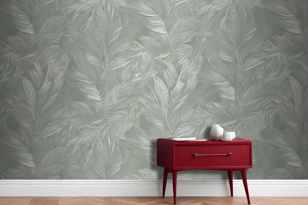 Üst Üste Binen Yaprak Veya Tüy Benzeri Şekillerle Yeşil Ve Beyaz Soyut Desen Antre Hol Koridor Duvar Kağıdı