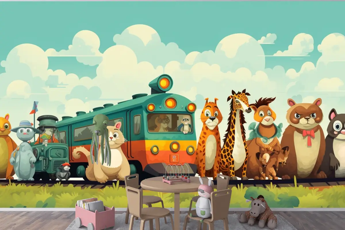 Üstünde Hayvanların Olduğu Bir Tren Ve Önünde Zürafalar Yazan Bir Tren Çocuk Odası Duvar Kağıdı