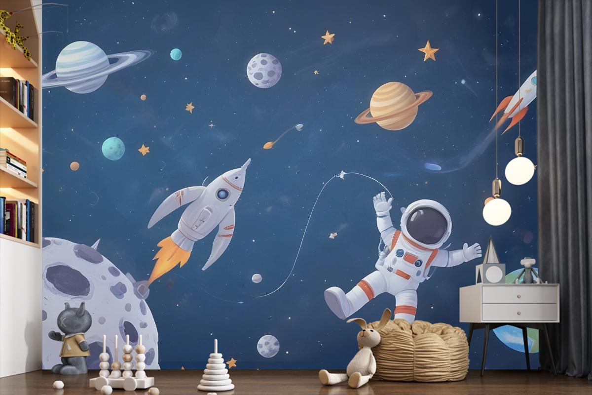 Uzay Gemisi Ve Astronotlu Çocuklar Suluboya Alanı Çocuk Odası Duvar Kağıdı