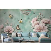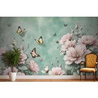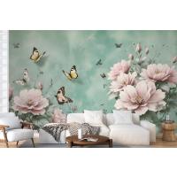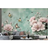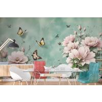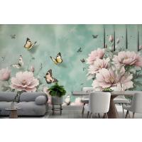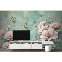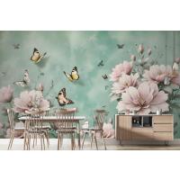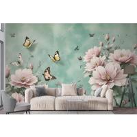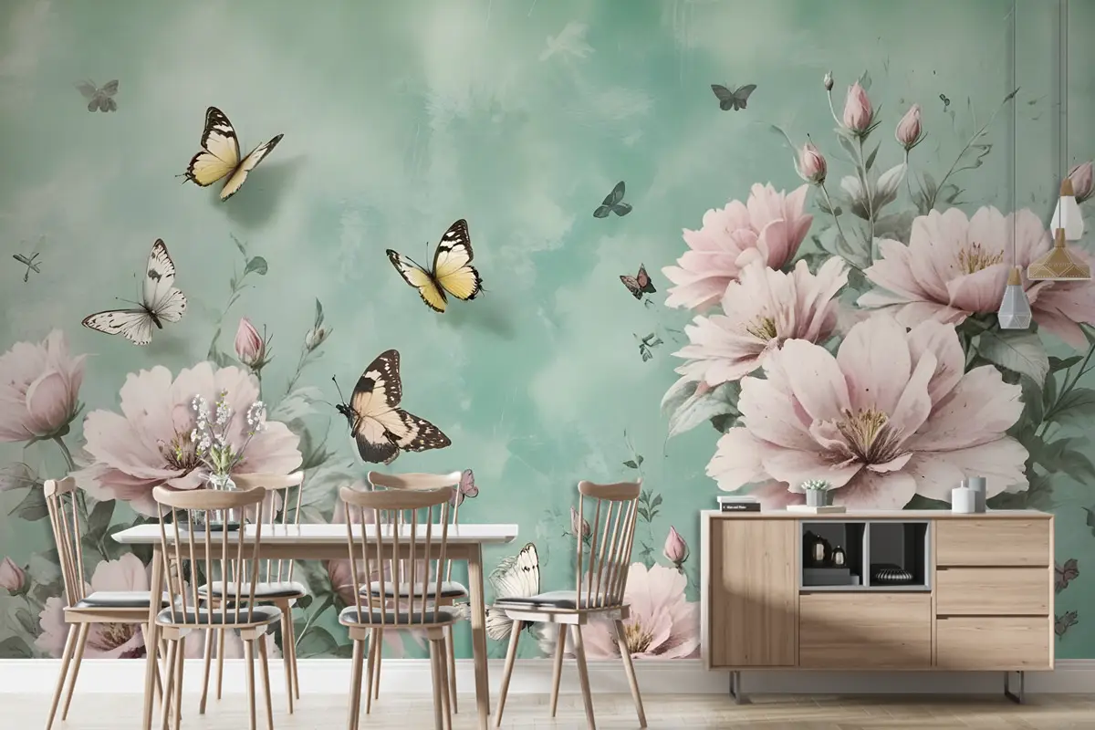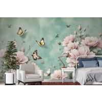 Vintage Pembe Çiçek Ve Sarı Kelebek Duvar Kağıdı