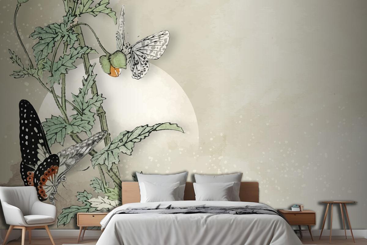 Yapraklı Kelebek Çerçeve Tasarımı Yatak Odası Duvar Kağıdı