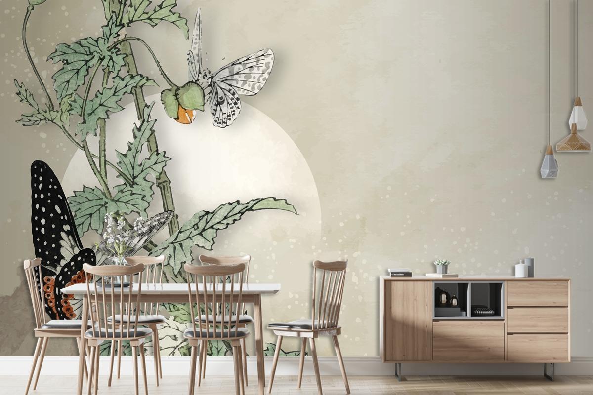 Yapraklı Kelebek Tasarım Vintage Duvar Kağıdı